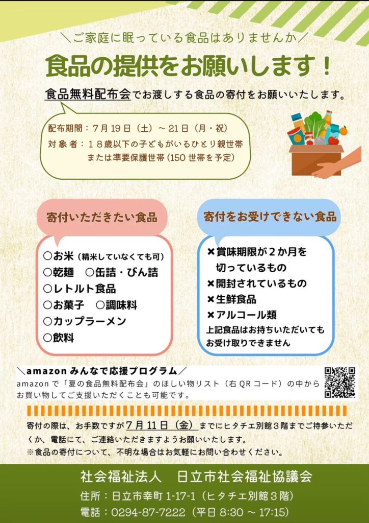 日立市社会福祉協議会が主催する、夏休みの子ども達へ向けた食料無料配布会への食品を寄付致しました。